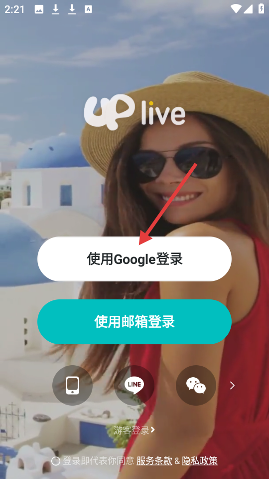 2、直播登錄頁,背景為人物圖像,設有Google、郵箱等多種登錄方式,還支持游客登錄,下方有服務條款相關提示。