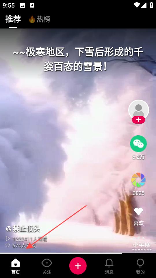 1、推薦界面,展示了一個極寒地區雪景的視頻,用戶可進行關注、分享等操作,底部有首頁、關注等導航欄。