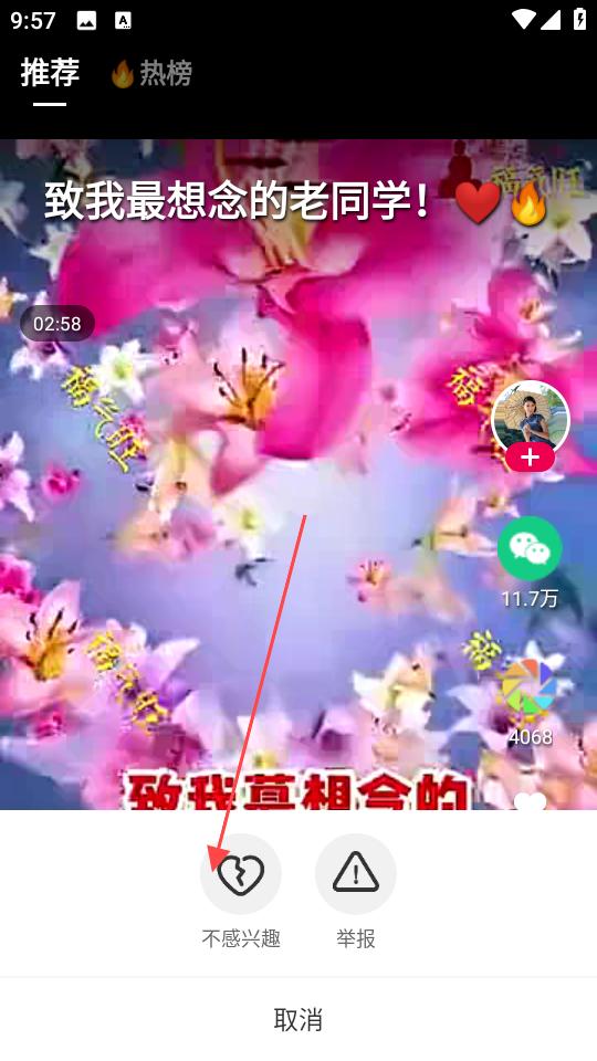 3、視頻界面,展示了一個致老同學的視頻,用戶可進行不感興趣、舉報等操作,方便用戶對視頻進行反饋和管理。