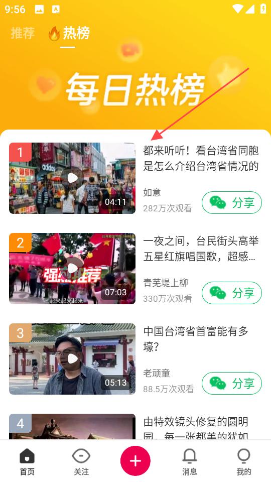 2、熱榜界面,展示了每日熱榜的視頻內容,包括視頻標題、發布者、觀看次數等信息,用戶可點擊視頻觀看或分享。