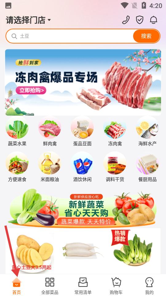 1、點擊首頁,可選擇門店、搜索商品,設凍肉禽專場活動,還有蔬菜水果等多品類入口,便捷選購。