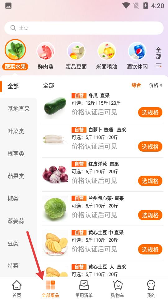 2、點擊全部菜品頁,以蔬菜展示為主,冬瓜、蘿卜等豐富多樣,可選不同重量規格,價格認證后呈現。