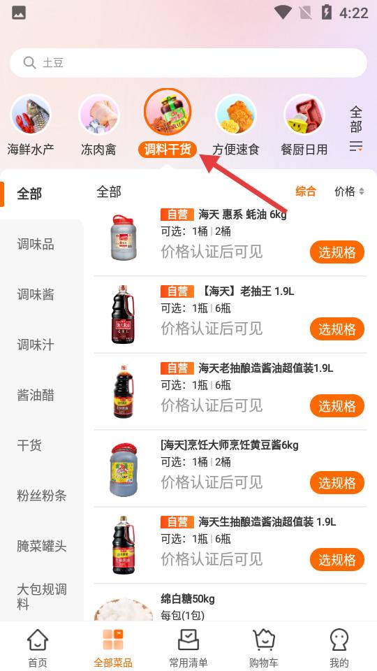 3、點擊調料干貨頁面,匯集海天等品牌的蠔油、醬油等調料,多種規格任選,滿足家庭及餐飲不同需求。
