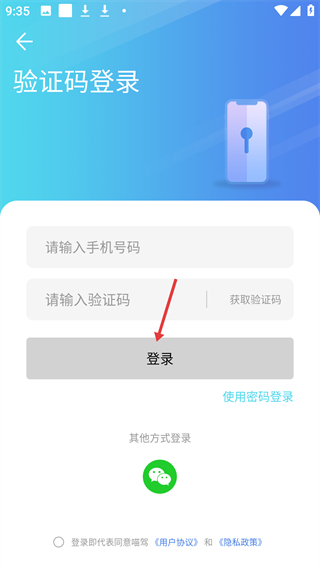 1、驗證碼登錄頁,可輸手機號驗證碼登錄,也可密碼或微信登錄,登錄需同意用戶協議和隱私政策。