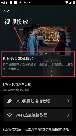 2、視頻投放頁,可將手機視頻同步車機播放,支持各大視頻應用,提供USB數據線和Wi-Fi熱點連接教程。