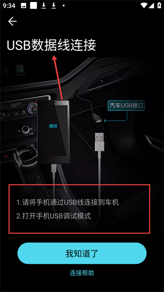 3、USB數據線連接頁,指導用戶將手機通過USB線連接到車機,并打開手機USB調試模式,助力手機與車機的連接操作。