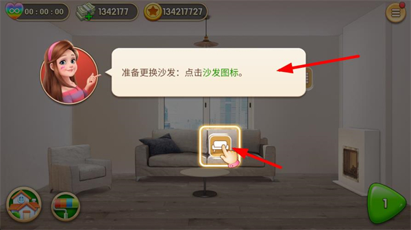 1、按提示更換沙發,點擊場景內的沙發圖標,觸發更換流程,推進家居裝扮的初始任務,逐步美化房間。