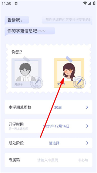 3、登錄后進入學籍信息填寫頁,需選擇性別,還可設置本學期總周數、開學時間、所處階段等信息,專屬碼為非必填項,完善后可推進流程。
