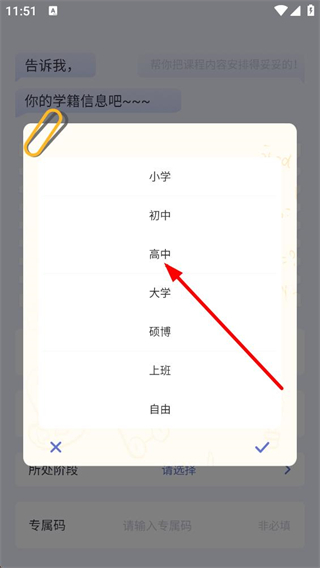 4、點擊所處階段選項,彈出選擇列表,包含小學、初中、高中等多個階段,選擇對應階段后確認,即可完成該信息的填寫。