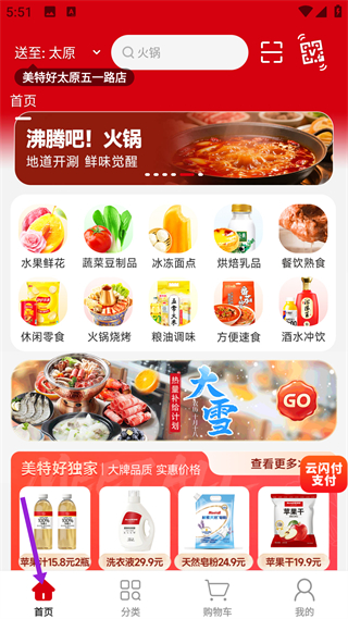 1、首頁定位太原五一店,分類展示生鮮食品等商品,設促銷欄與優惠區,是商品與活動的綜合展示入口。