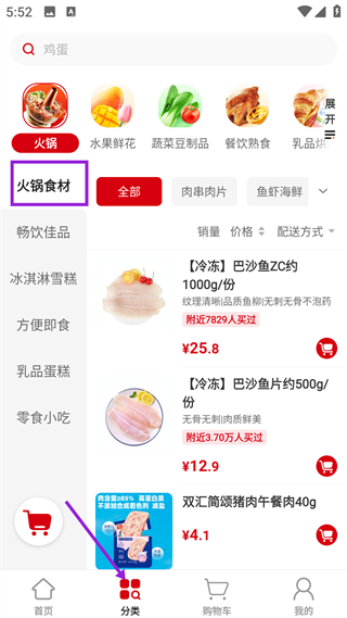2、分類頁面聚焦火鍋食材,展示巴沙魚等商品,支持銷量價格排序,是細分品類的商品選購頁面。