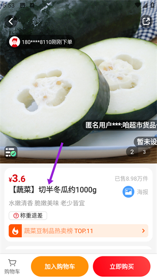 4、冬瓜商品頁展示價格銷量與賣點,標注熱賣榜排名,設加購購買按鈕,是蔬菜類單品詳情頁。