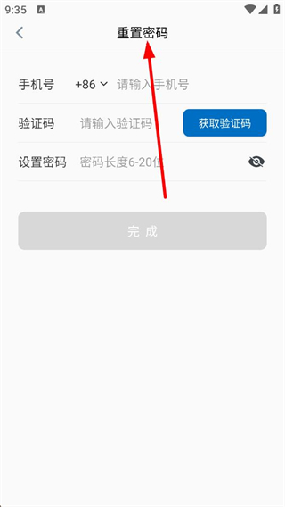 4、重置密碼頁面需輸入手機號,獲取并填寫驗證碼后設置新密碼,完成信息填寫后點擊完成按鈕,即可完成密碼重置操作。