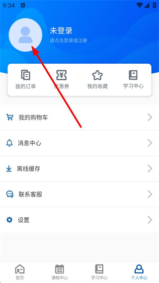 1、進入個人中心頁面可看到未登錄提示,還有我的訂單優惠券等功能入口,以及我的購物車消息中心等選項,點擊登錄或注冊可進入登錄界面。