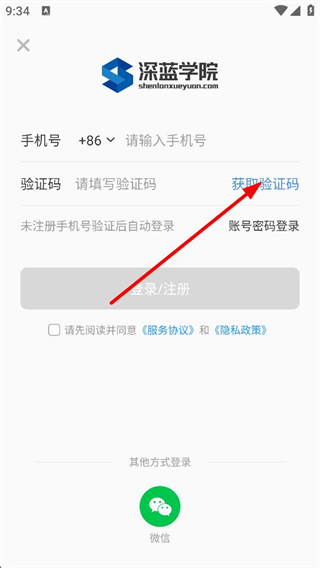 2、登錄界面支持驗證碼登錄,需輸入手機號并點擊獲取驗證碼,填寫后勾選服務協議和隱私政策,也可選擇微信等其他方式完成登錄或注冊。