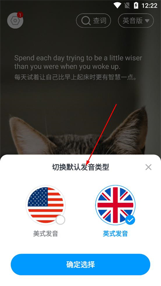 1、在發音類型切換彈窗,選擇英式發音選項,點擊確定選擇按鈕,完成默認發音類型的切換設置。