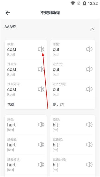 4、在AAA型動詞列表中點擊單詞旁的發音按鈕,收聽cost、cut等單詞的發音,輔助記憶學習。