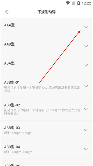 3、進入不規則動詞頁面,查看不同類型的不規則動詞分類,選擇AAA型分類展開對應的內容列表。
