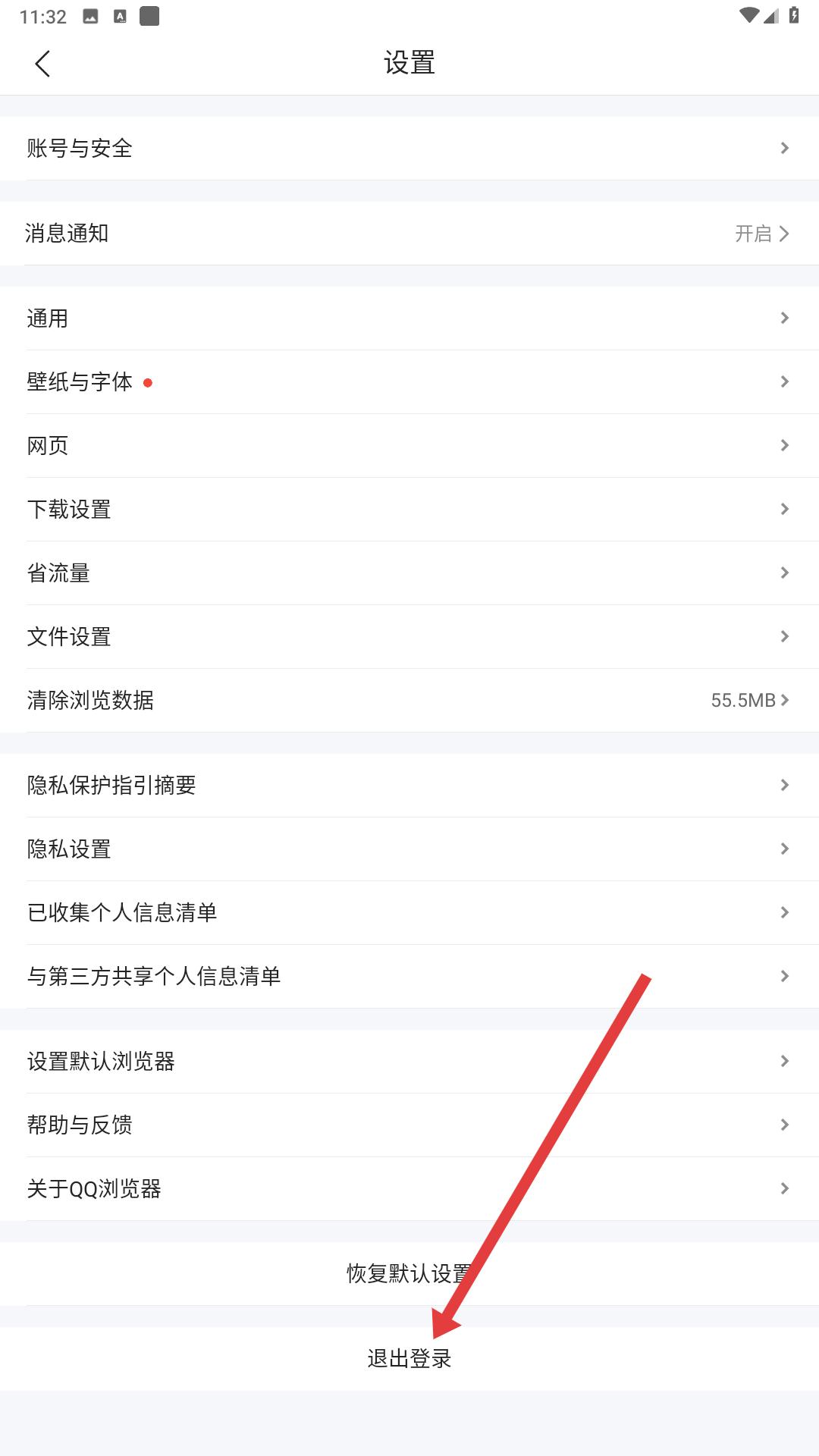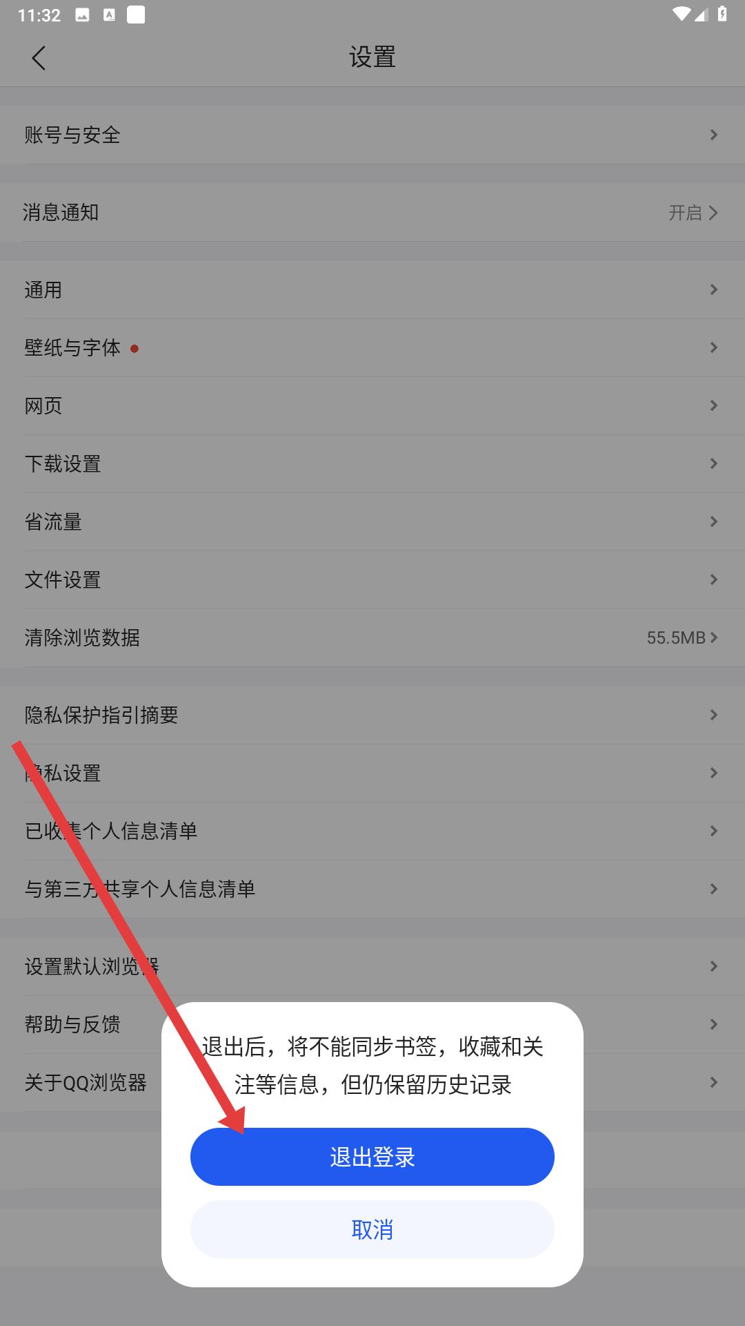 4、此時會彈出提示框,說明退出后將不能同步書簽、收藏和關注等信息,但仍保留歷史記錄,點擊退出登錄,即可完成退出操作。