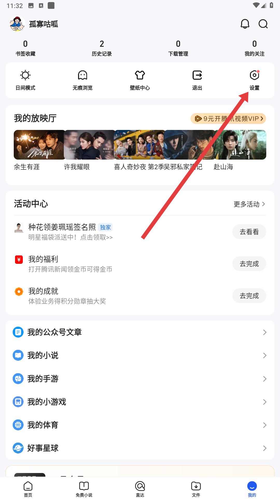 2、個人頁面,有書簽收藏、歷史記錄等功能,點擊設置,進入設置界面。