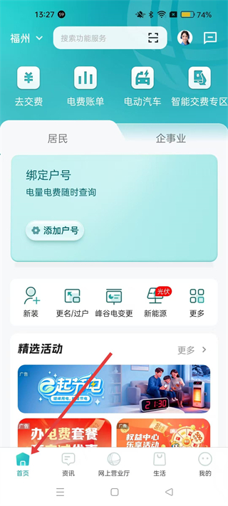 1、進入網上國網首頁,可進行去交費、查看電費賬單等操作,居民板塊可綁定戶號隨時查詢電量電費,還有新裝、更名過戶等業務辦理入口及精選活動板塊。