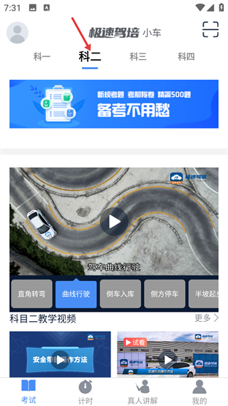 2、科二頁,提供曲線行駛等項目教學視頻,覆蓋核心考點,通過視頻指導幫助學員掌握科二實操技能。