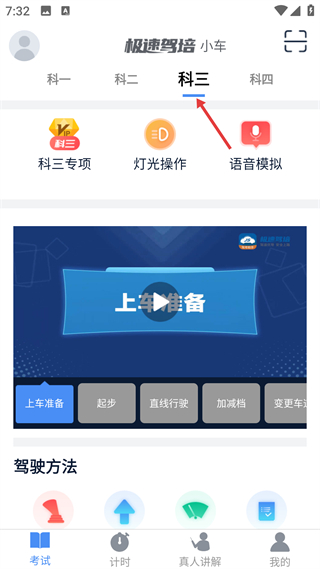 3、科三頁,含燈光操作等功能,聚焦上車準備等流程,模擬考試場景,助力學員熟悉科三環節與規范。