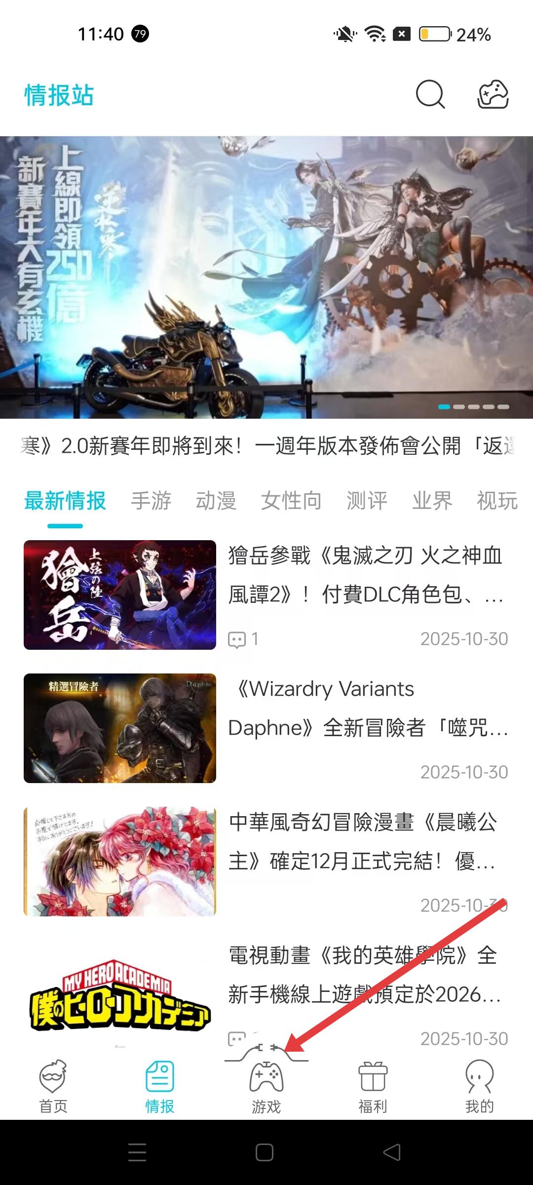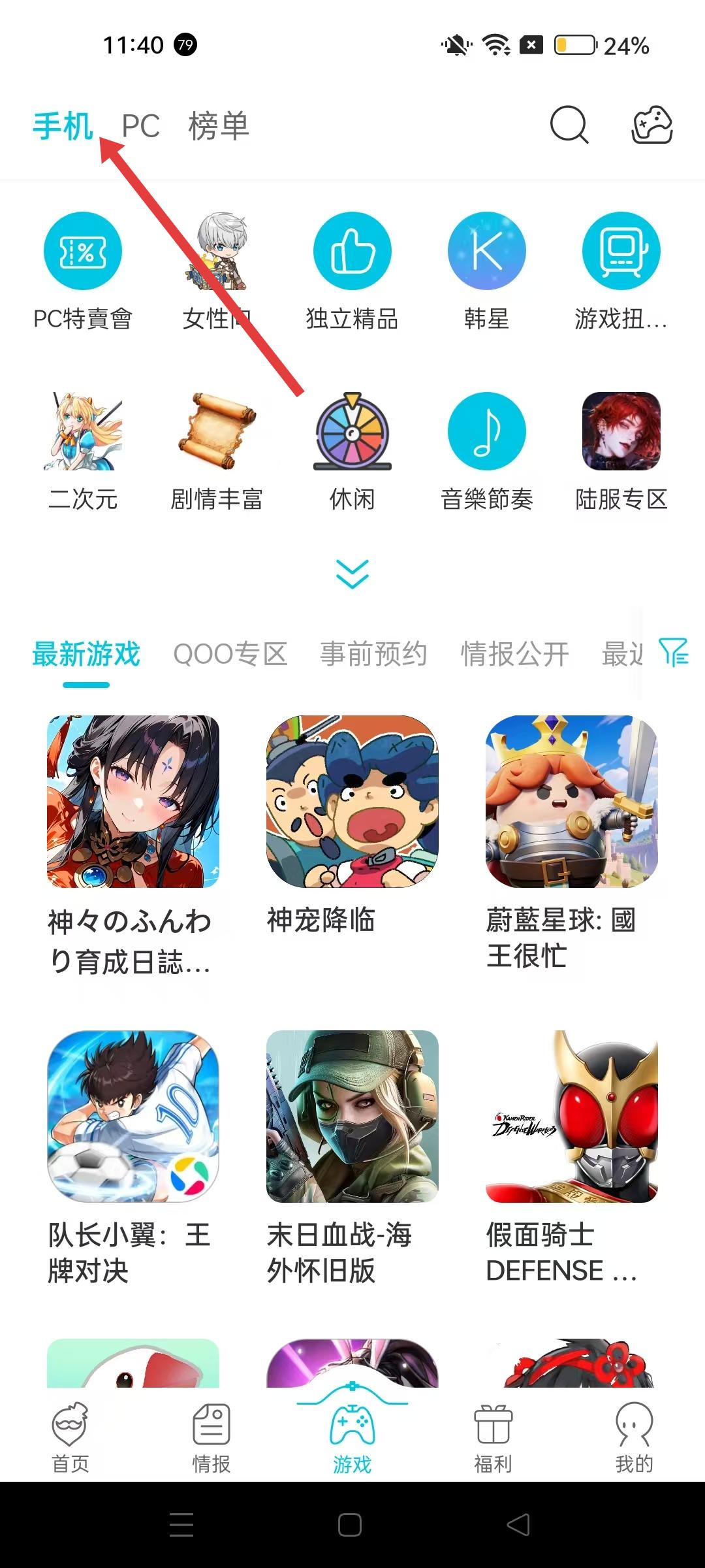 1、點擊游戲板塊,可切換手機、PC、榜單分類,手機分類下有多種游戲標簽和最新游戲推薦,方便查找不同類型的手機游戲。