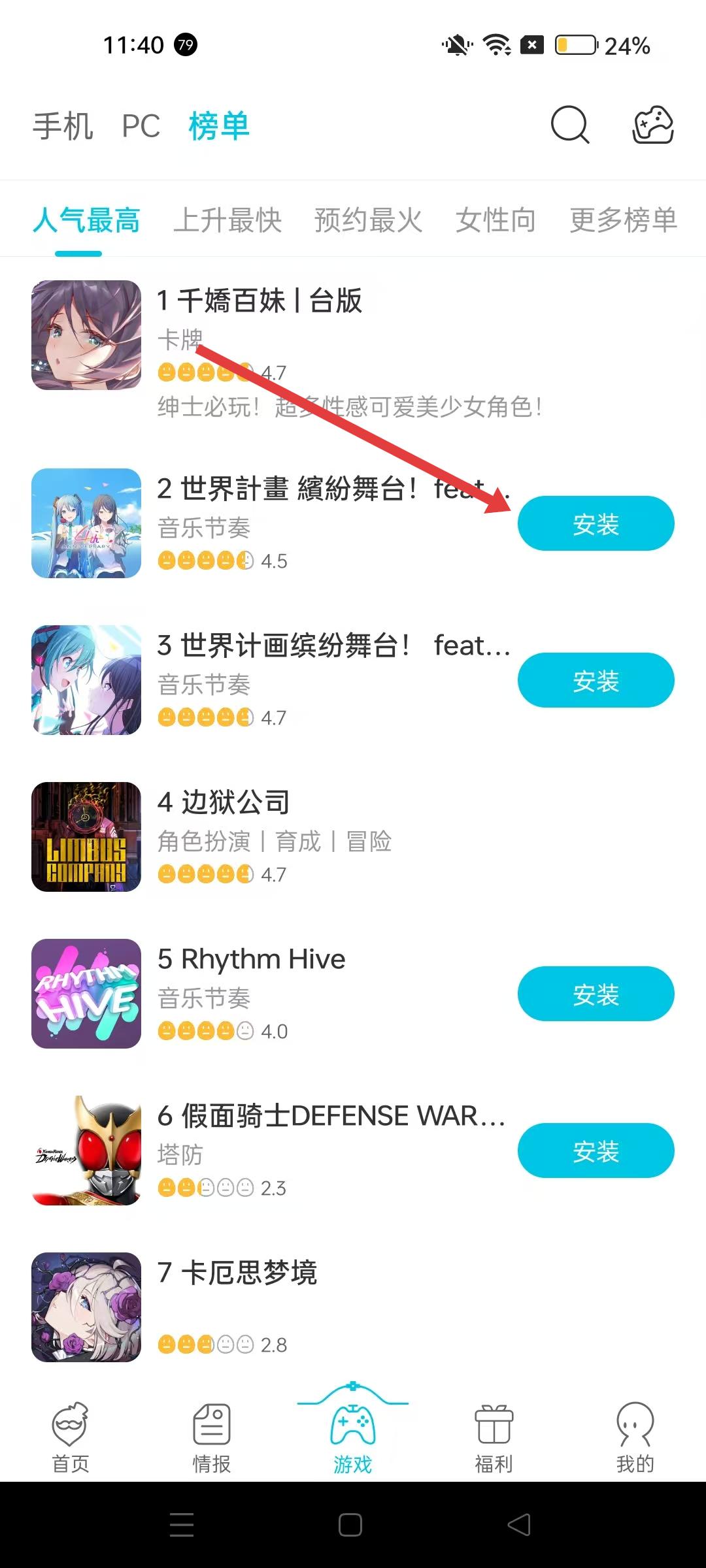 2、榜單分類中,能查看人氣最高、上升最快等各類游戲榜單,找到熱門游戲后可點擊安裝按鈕進行安裝。