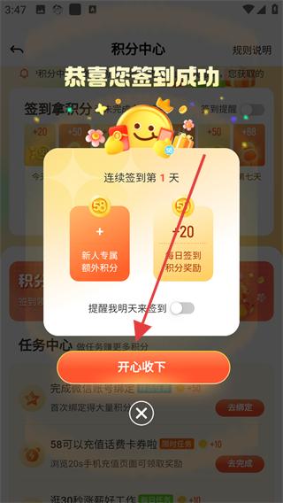 3、簽到完成后點擊開心收下按鈕,領取簽到獎勵,關閉提示彈窗,繼續操作。