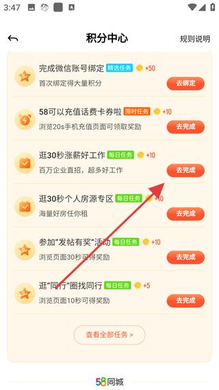 4、在任務中心頁面可查看各類任務如完成微信賬號綁定、逛30秒粉薪好工作等,點擊去完成按鈕,完成任務獲取更多積分。