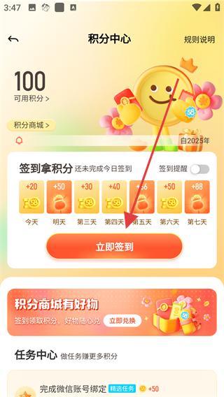 2、進入積分中心頁面,點擊立即簽到按鈕,完成每日簽到,獲取相應的積分獎勵,如新人專屬額外積分和每日簽到積分。