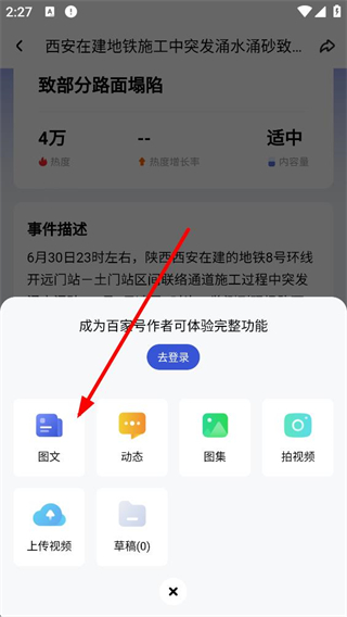 3、點擊去發布按鈕,會彈出創作功能選項,包含圖文、動態等創作形式,登錄后可選擇對應形式發布相關內容。