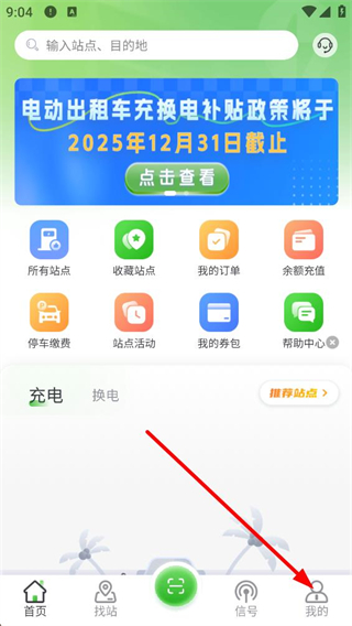 1、進入界面先看到首頁布局,有搜索欄和電動出租車充換電補貼政策提示,底部有首頁找站信號我的等按鈕,點擊我的進入對應頁面。
