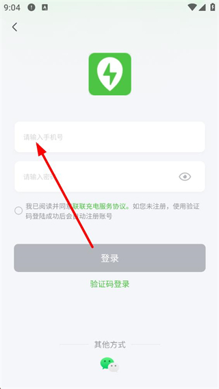 3、點擊未登錄后進入登錄界面,可選擇驗證碼登錄方式,輸入手機號獲取驗證碼,勾選我已閱讀并同意聯聯充電服務協議后嘗試登錄。
