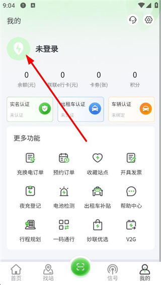 2、進入我的頁面后,能看到未登錄狀態,還有余額聯聯e行卡等信息,以及實名認證出租車認證等選項,更多功能里有充換電訂單等入口。