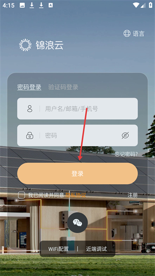 1、登錄頁,有密碼和驗證碼登錄方式,輸入賬號密碼勾選協議可登錄,也可微信登錄、注冊或找回密碼,方便管理光伏設備。