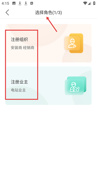 2、選擇角色界面,可選擇注冊組織或業主,根據身份注冊賬號,滿足光伏領域不同角色業務需求。