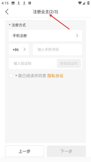 3、注冊業主界面,選手機注冊,輸入手機號、驗證碼勾選協議下一步,完成業主注冊,便于管理自家光伏電站。