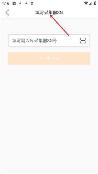 4、填寫采集器SN界面,填寫SN號點下一步,可對采集器入庫管理,助力光伏設備精細化管理。