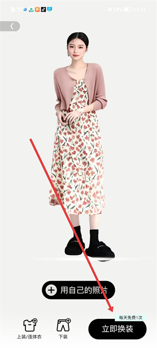4、在換裝頁面可選擇用自己的照片進行換裝,點擊立即換裝可每天免費換裝一次,還能對上衣連體衣、下裝進行搭配。