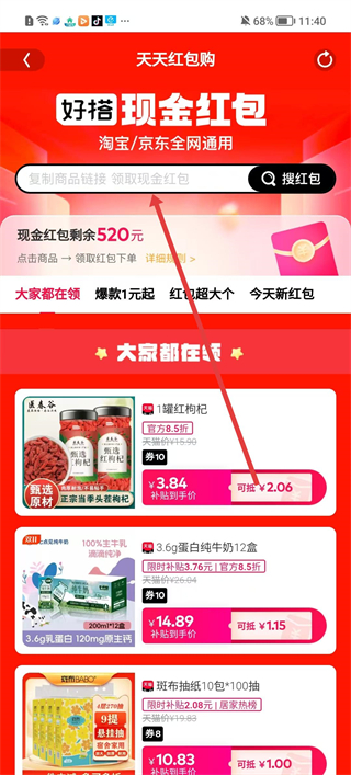 3、進入天天紅包購頁面復制淘寶或京東商品鏈接可領取現金紅包,還能查看大家都在領的爆品紅包。
