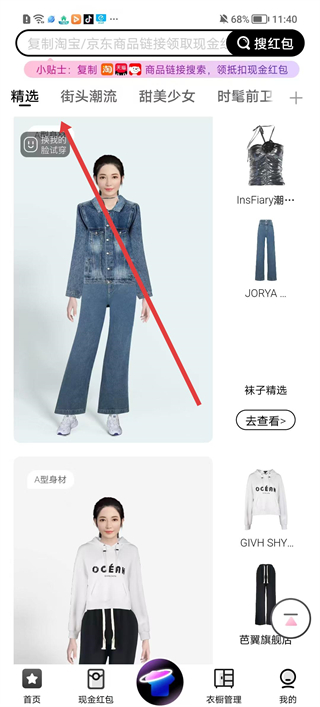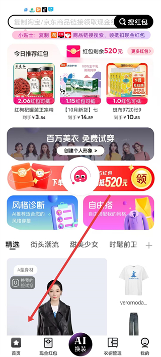 1、進入穿搭盒子APP首頁,可查看今日推薦紅包和精選穿搭風格,點擊換裝可進入換裝頁面。