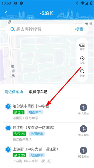 2、找泊位頁面可查看附近停車場列表,顯示各停車場余位、距離等信息,選擇目標停車場點擊進入詳情頁。