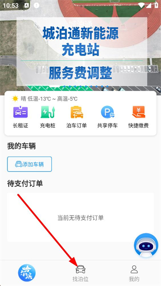 1、進入城泊通首頁,可使用長租證、充電樁等功能入口,點擊底部找泊位選項,能進入停車泊位查詢頁面。