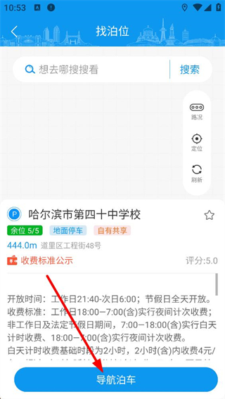 3、停車場詳情頁可查看開放時間、收費標準等信息,點擊導航泊車按鈕,即可發起前往該停車場的導航操作。