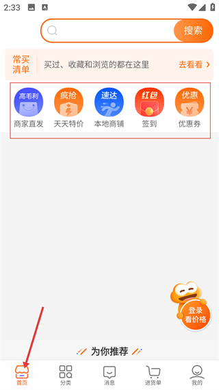 2、首頁設搜索欄與常買清單,有多種功能入口,需登錄后查看價格,核心服務于商家的進貨采購需求。
