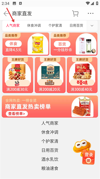 3、商家直發頁按品類分類展示商品,含推薦與好貨板塊,搭配滿減優惠,便于商家快速選品進行進貨。