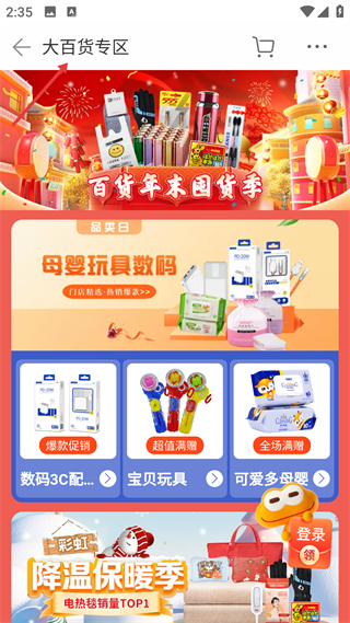 4、大百貨專區聚焦百貨類商品,設主題活動,分多細分品類,有促銷滿贈等優惠,適配商家批量采購。