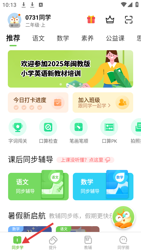 1、同步學首頁顯示用戶為二年級上,有新教材培訓公告,設字詞闖關等學習功能,還有課后同步輔導入口。
